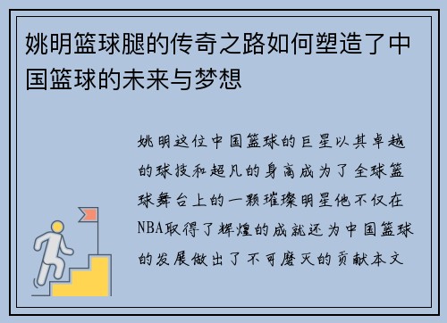 随着女篮赛季的重启,姚明作为中国篮球的标志性人物,再次站在了风口浪尖,引领着女篮的发展。球迷们对即将到来的比赛充满期待,渴望看到精彩的对决与新星的崛起。在这篇文章中,我们将从姚明在女篮复赛中的角色、赛事对球迷的重要性、新兴球员的表现以及未来展望四个方面进行详细阐述。这不仅是体育竞技的较量,更是情感与梦想交织的平台,让我们共同期待这场盛宴。 1、姚明在女篮复赛中的角色 姚明作为中国篮球协会主席,其...
