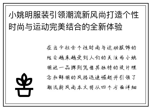姚明联名球鞋全新Logo设计的发布,标志着篮球时尚潮流的新一轮变革。作为中国篮球的代表性人物,姚明不仅在赛场上取得了卓越成就,他的影响力也渗透到了时尚领域。这款球鞋的Logo设计,不仅展示了姚明个人的风格与气质,更是结合了现代元素与传统文化,赋予了消费者新的视觉体验和情感共鸣。本文将从Logo设计理念、市场反响、篮球文化影响及未来发展趋势四个方面进行阐述,以深入分析这款球鞋在引领篮球时尚潮流中的重...